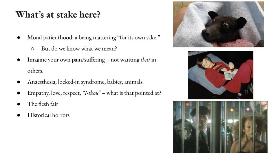 I’ll also say there are theories of things like consciousness that are very profligate about which beings have them. So panpsychists think that everything has some amount of consciousness. I don’t think that helps. Basically at that point, you just need a new theory of over-attribution, right? So you’re in a fire and there’s a baby and there’s two teddy bears, right? Maybe you think the teddy bears are conscious in some sense, but you still need some story about why you should save the baby. Or: I claim you should save the baby. And I claim that if you don’t save the baby, if you save the teddy bears, then that’s a type of over-attribution, you’re giving something to the teddy bears that they don’t have, or you likely are. So those are a few comments about the stakes.