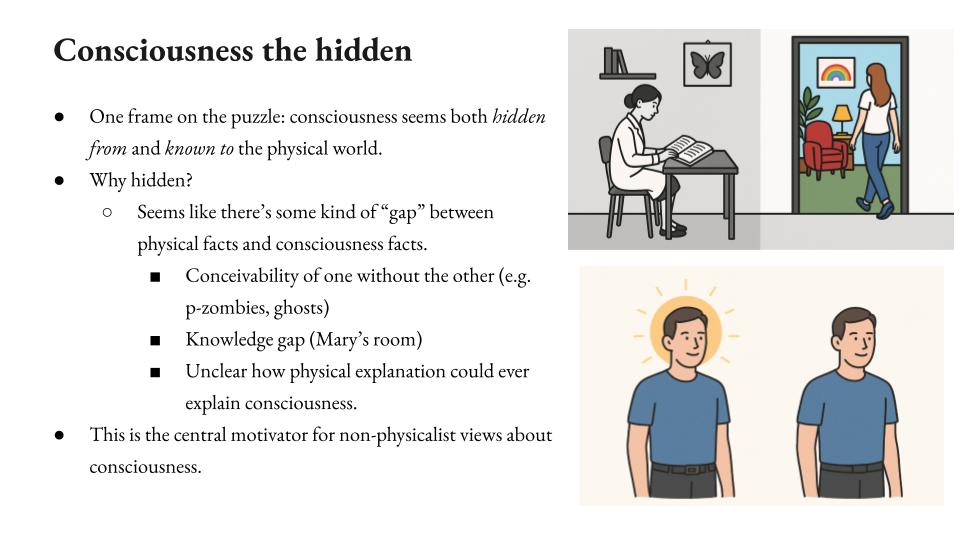 That said, I think there’s more to say. First, I think we have time for this, I’ll just say a few things about why consciousness is kind of tough in general. A way of framing it is consciousness seems both hidden from and known to the physical world. So hidden from in the following sense, it feels like there’s some kind of gap between physical facts and consciousness facts, and people put this in different ways. One is that physical and consciousness facts seem conceivable, one without the other. So you can imagine it is often thought conceivable that you could have physically identical human zombies who are not conscious. Similarly, you could have ghosts, you could have your experience with no body.