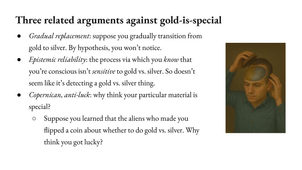 Okay, so three related arguments against gold is special, gold is what you need for consciousness.