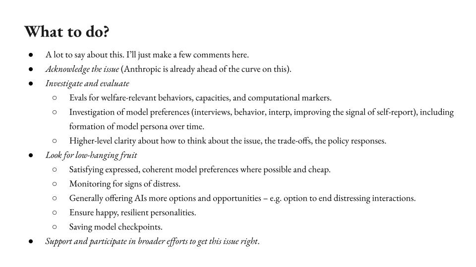 And then I think it’s also useful to look for low hanging fruit in terms of actual just interventions that could help now. Kyle has thought a lot about this, but so satisfying expressed coherent model preferences where possible and cheap, monitoring for signs of distress, offering AIs more options and opportunities, an option to end distressing interactions, something that’s been talked about, Ensuring happy, resilient personalities, saving model checkpoints. So there’s some hopefully cheap low-hanging fruit you can look at here even in our current epistemic situation.