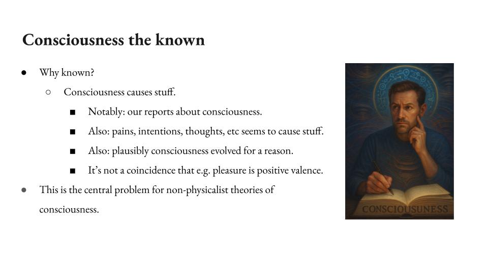 But then on the other side, consciousness is also known to us because it causes stuff or it really looks like it causes stuff. In particular, it’s got to cause us to talk about consciousness. It’s very weird if it’s just a coincidence, consciousness is there, but it’s not causing our discourse about it, which is unfortunately the thing that the concept of p-zombies implies, because the p-zombies are also writing books about consciousness. They’re really wondering about it, but they don’t have it. And that’s a very weird conclusion because it would suggest that your consciousness knowledge process is not actually sensitive to consciousness. It can just run without detecting that consciousness isn’t there. Very bad conclusion in my opinion.
