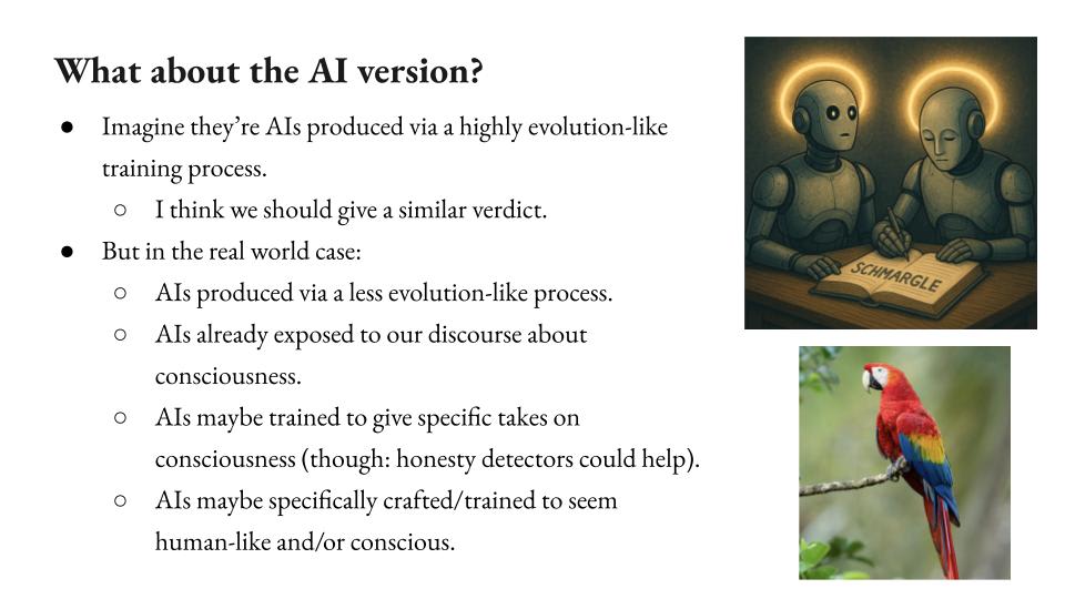 That said, I want to give a different argument for why I think AIs and even AIs that aren’t functionally organized like us might be conscious. And here’s the sort of intuition. So imagine we discover evolved aliens that fully share all of the traits that I listed on the slide about the AIs I’m interested in. So they have all our consciousness-associated behaviors and capacities, even internal computational similarities, and they have this term “blargle” that they use in a way that just totally maps onto our term consciousness and including with our specific philosophical confusions. So if you ask them about an alien neuroscientist in a black and white room, and then she goes out and sees a rose, they’d be like, “Ah.” Then she learns the “blargle” that she couldn’t learn in the room, right? But their brains are made out of pretty different materials and organized in a pretty different way.