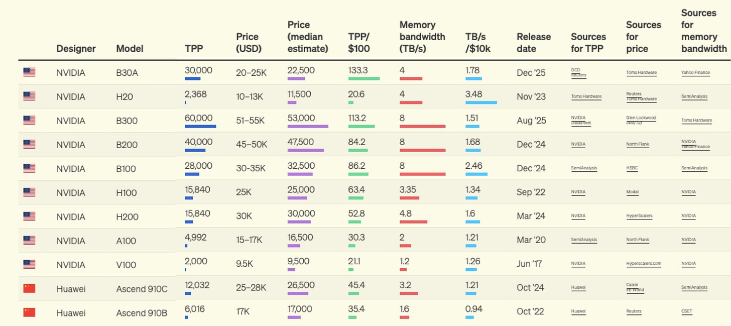 H200 is NVIDIA’s AI chip from the Hopper generation, considered the next most powerful after the newest Blackwell models, B100 - B300 (see the AI chip comparison table in Figure 1). The model was released in March 2024 and, according to an estimate by Center of American National Security (CNAS), NVIDIA may have so far sold around 2 million units of this model in the United States. While the chips are designed by NVIDIA, they are produced in Taiwan by Taiwan Semiconductor Manufacturing Company (TSMC).