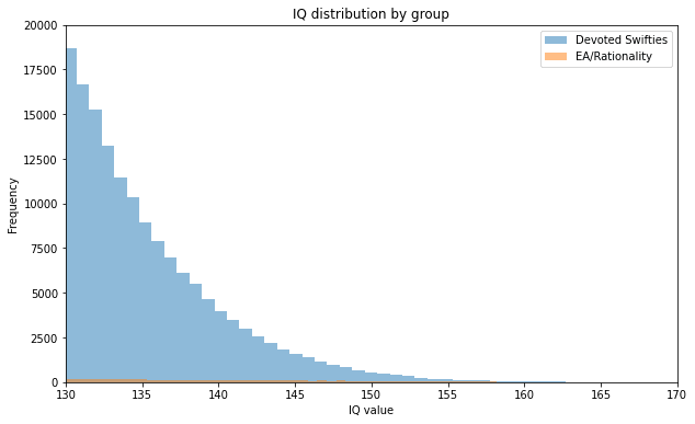 A poll estimated that 22% of the US population identify as taylor swift fans, which is 66 million people. Let’s classify the top 10% most devoted fans as the “swifties”, which would be 6.6 million in the US alone. The Eras tour was attended by 4.35 million people, and that was famously hard to get tickets for, so this seems reasonable. Let’s say they have the same IQ distribution as the general population, and compare them to the US Rationalist/EA community: