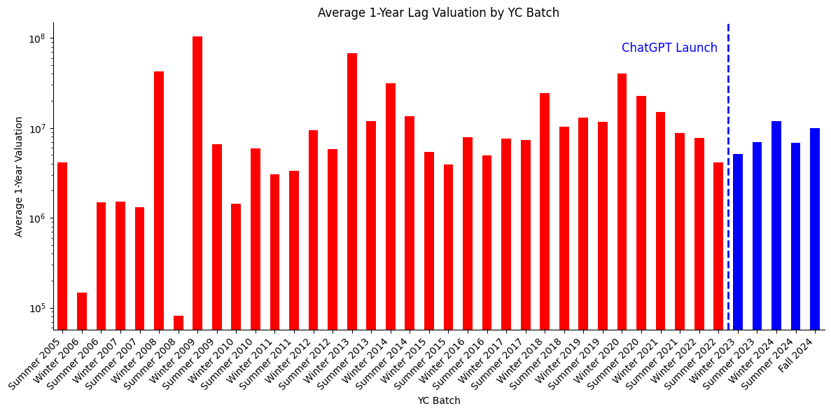 Of the 20 companies which had the highest 1 year growth post-YC, only 1 (Legora) was a 2023+ batch company, even though 34% of the companies I could find 1 year growth data for were 2023+. The average valuation of a YCombinator company one year after it goes through YC is only $7.9M for 2023+ batches, compared to $13.3M for <2023 batches.