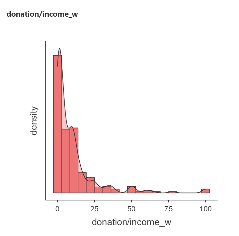 I’m having a hard time understanding what you’re saying with these graphs. Are these for self-identified ETG people, or for everyone in your survey? Donation_w shows something like 60% (no y scale so not sure) of population don’t give at all, is that right? And around 10% give $20K or more? Thanks.