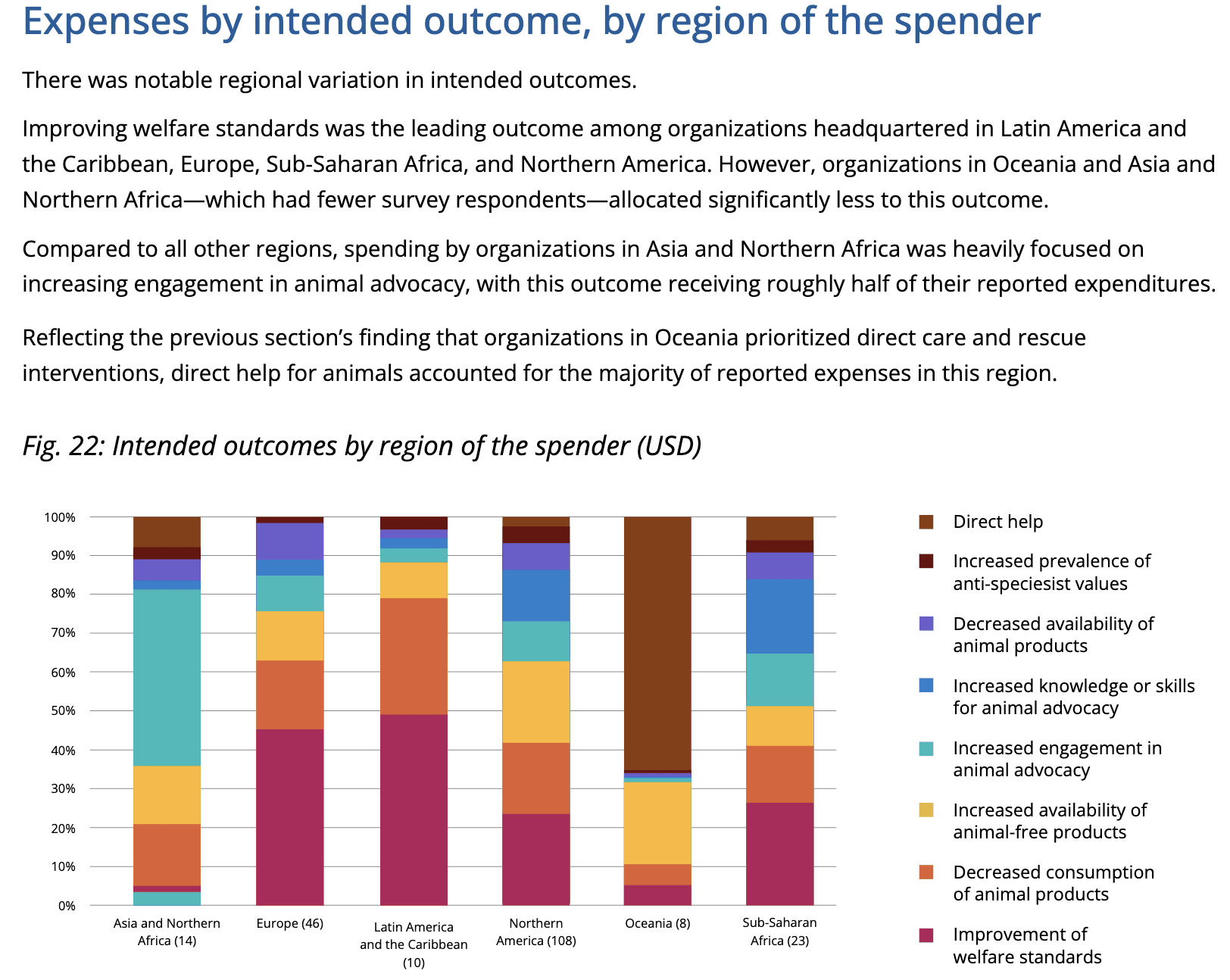 As well as this drill down by intended outcome. Naively it seems that SSA’s allocation looks like North America’s for instance, except that the latter has a greater proportion of org spending going to increasing availability of animal-free products, which makes sense given relative wealth: