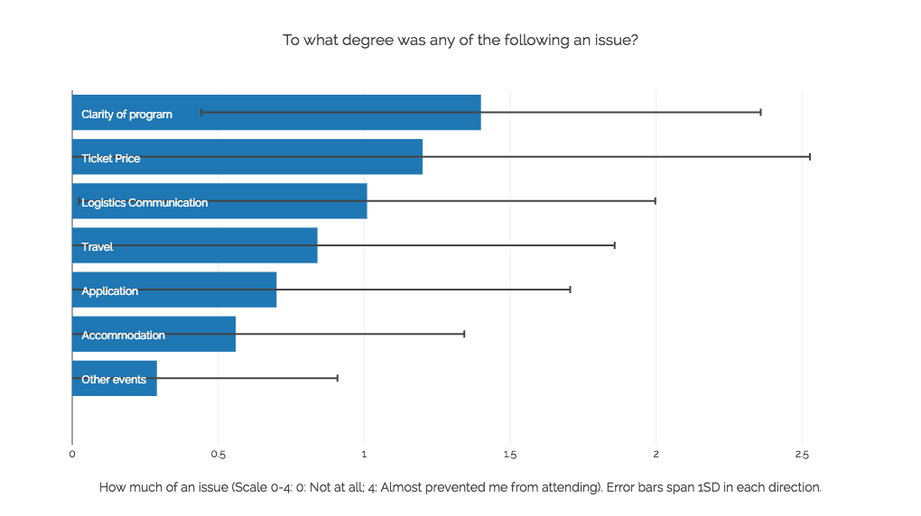 In our Follow-up Survey, we asked attendees to rate how much different parts of the event were issues for them. The mean was 1.5 on a 4 point scale, suggesting that none of these were terribly bothersome on average; however, of the issues listed, the clarity of the program, logistics communication, and the ticket price appear to have been the biggest concerns for attendees. This matches the feedback that we have received in-person and online.