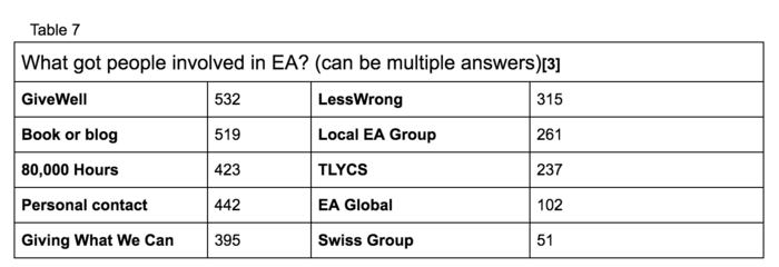 Re: Table 7 and the sentences “As seen in Table 7, personal networking did not come out as the top source for actually getting people involved in EA, though it remains within the top five. Once introduced to EA, it would appear GiveWell, books and/or blogs, and 80,000 Hours are the three most potent ways to keep engage new EAs.”