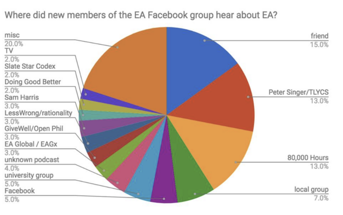 To compare this to our data, we selected the 406 EAs who self-reported being a member of the EA Facebook group and who said they joined in 2016 or 2017 (though this would only go up to April-June 2017 when the survey was active). Among this subsample in our survey, the top five results were 19% saying personal contact, 17% saying “other”, 10% saying 80,000 Hours, 7% saying Doing Good Better, and 6% saying a TED Talk. This matches closely with the results gathered from Facebook despite a different data collection method (forced response for group membership vs. voluntary survey taking) and reporting methods (self-report from choices including others vs. self-reported freeform text with no prompts).