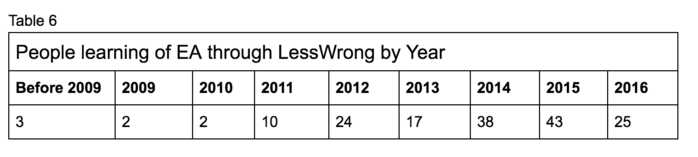 As of 2016, LessWrong dropped out of the top five list of introductory sources after being one of the top three from 2009 to 2015.