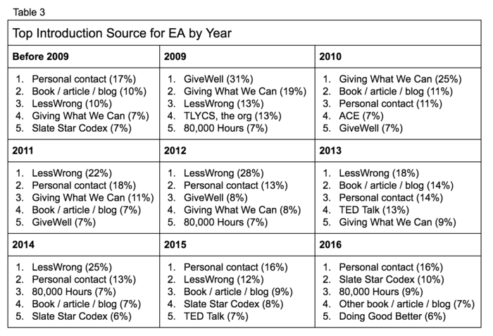 We can also see how referrers have changed over time by cross-referencing people’s self-report of how they got involved with the year they report joining the movement. When interpreting the 2017 results within this context, we find that getting introduced to EA through personal networks has historically been most common (Table 3).