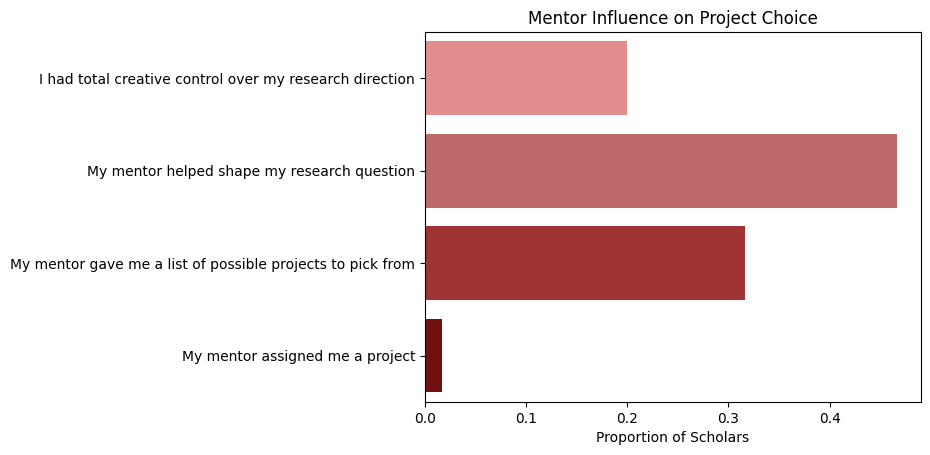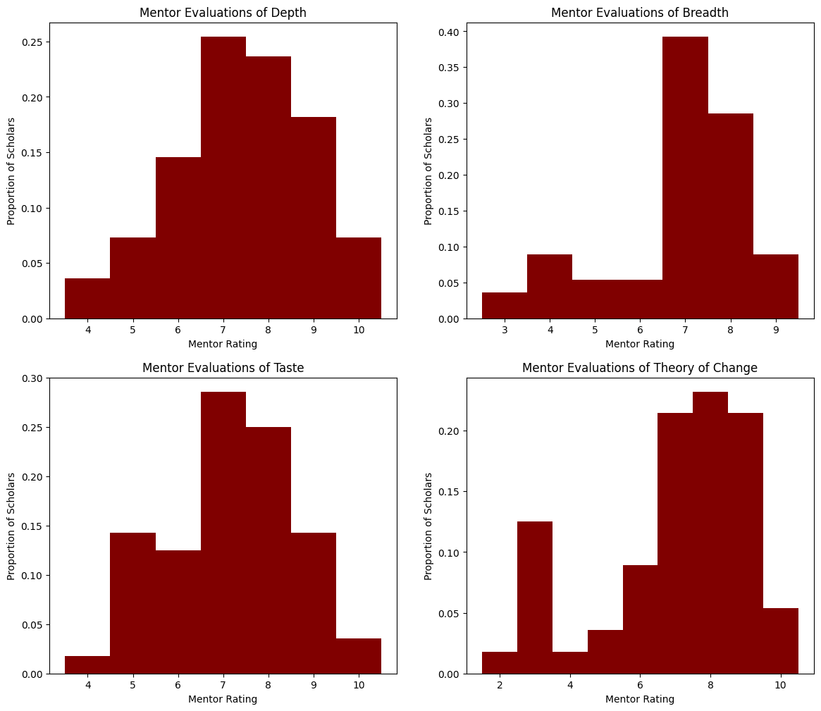 Mentors were enthusiastic for scholars to continue their research, rating the average scholar 8.1/10, on a scale where 10 represented “Very strongly believe scholar should receive support to continue research.”