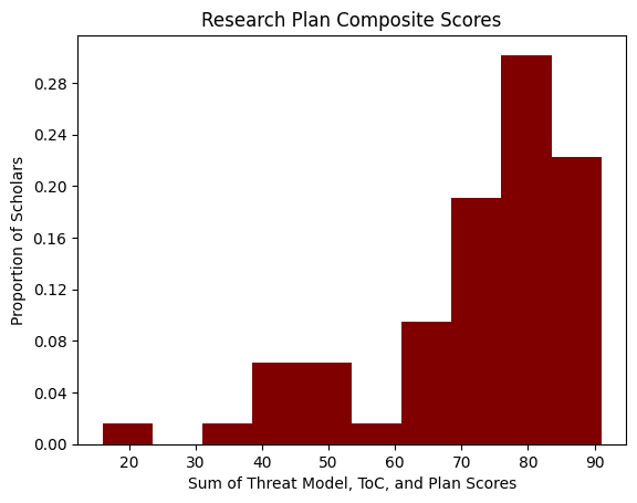 The median scores on the three respective sections were 15⁄20 points, 32⁄40 points, and 32⁄40 points. The median overall score was 76⁄100 points, showing that most scholars can effectively formulate and present a research plan.