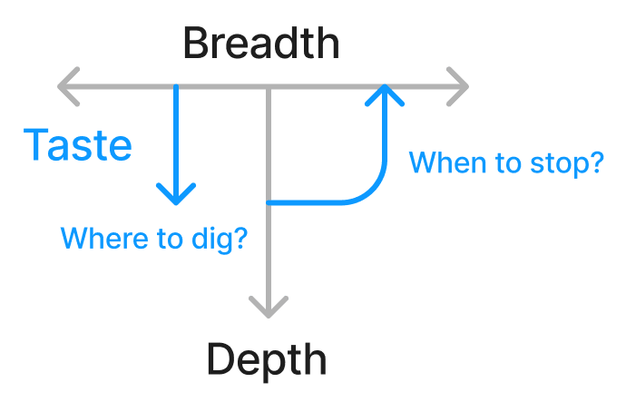 Taste: Good judgment about research direction and strategy, including what (sub-)questions to investigate, what hypotheses to consider, what assumptions to test, how to measure progress, how to present findings, how to balance risks such as capabilities advancements, and when to cease or pivot a line of research.