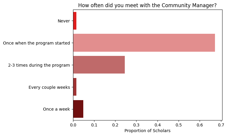 Unlike last summer’s program, the number of scholars facing publication record as an obstacle decreased, instead of increasing. This suggests that scholars in the most recent program focused more deliberately on a publishable project instead of pivoting repeatedly or working on unpublishable work, which is consistent with our anecdotal experience. Similarly, software engineering experience decreased as an obstacle during the past program but increased last summer, suggesting that scholars found more opportunities to develop their coding abilities or realized that generic programming skills are less of an obstacle than they had previously believed. The magnitude of the changes in software engineering in the most recent program and last Summer was small enough that the difference could easily be explained by randomness in scholar selection.