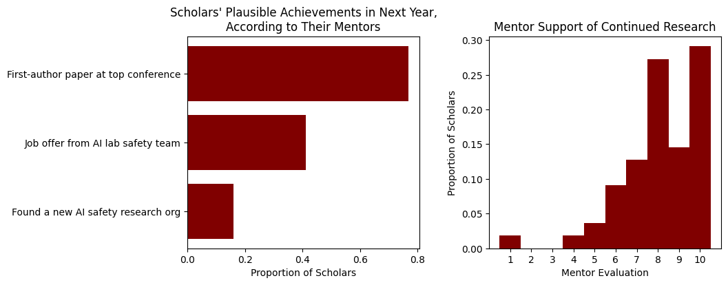 According to mentors, 77% of evaluated scholars could achieve a top conference paper, 41% could receive a job offer from an AI safety team, and 16% could found a new AI safety org within the next year.