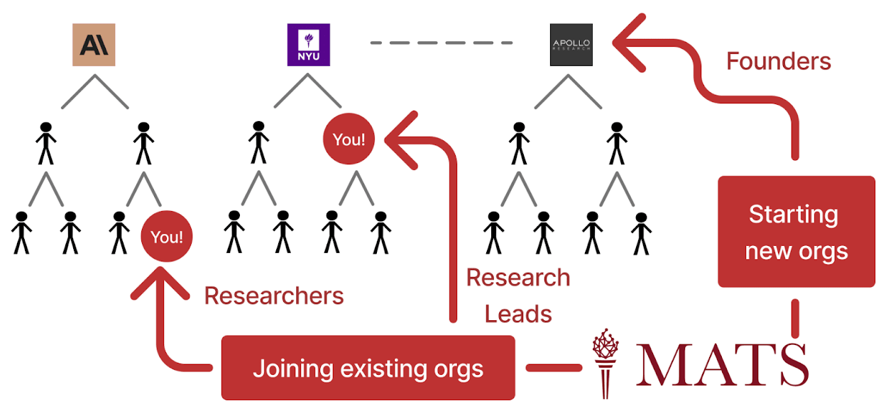 MATS expands the talent pipeline for AI safety research by empowering scholars to work on AI safety at existing organizations, found new organizations, or pursue independent research.