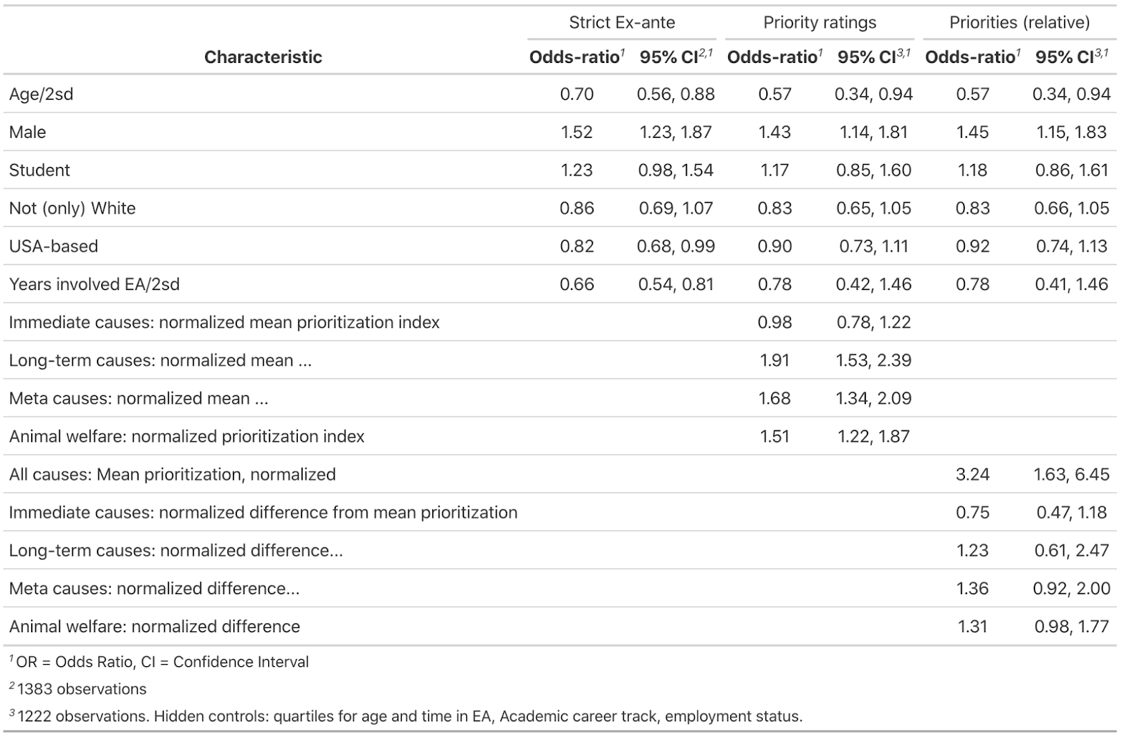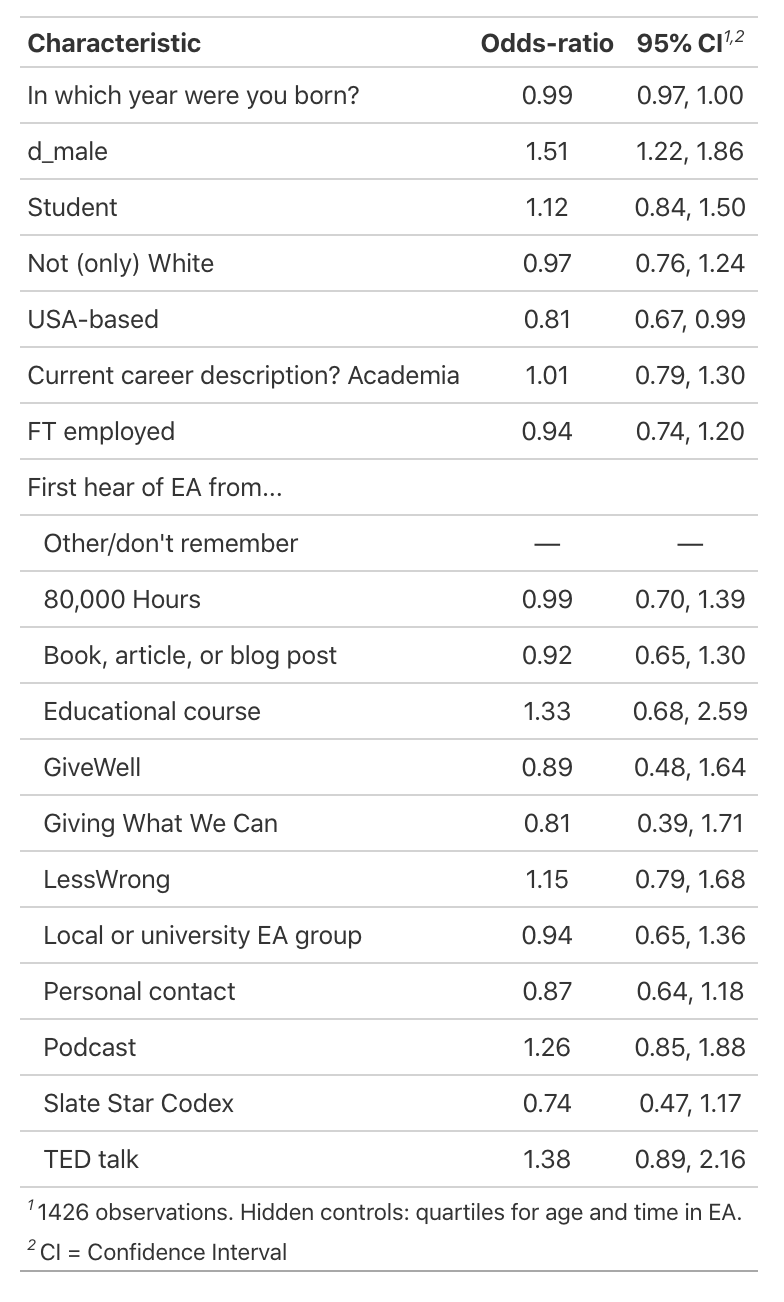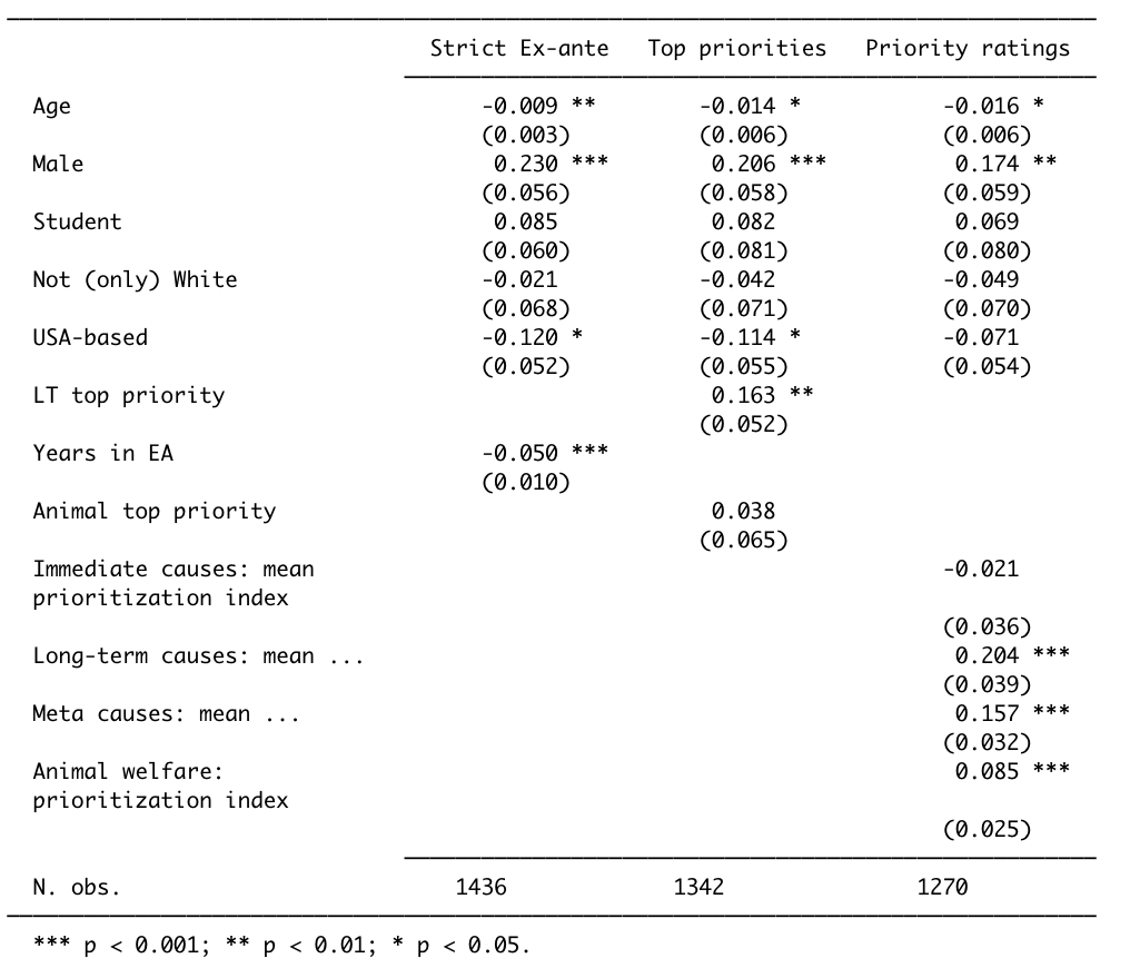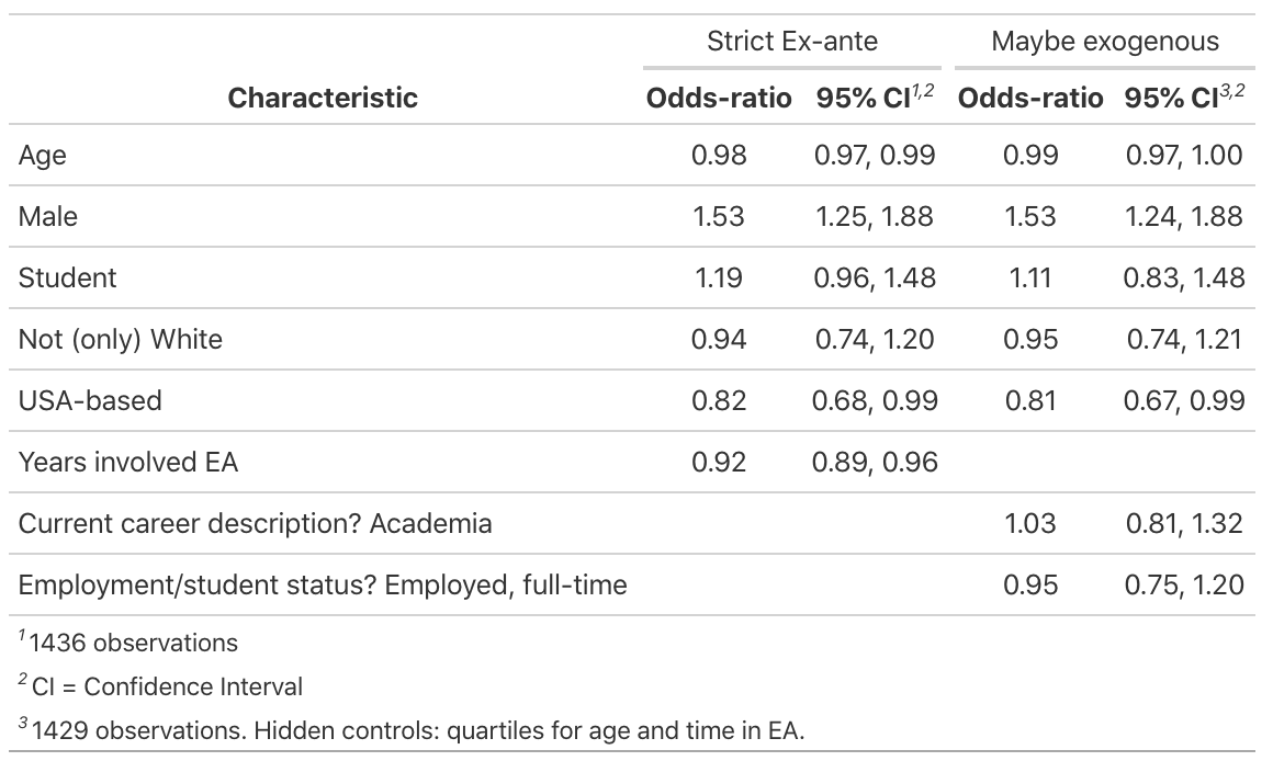 The first (“Strict Ex-ante”) columns consider only those ‘ex-ante’ characteristics that (at least if accurately reported), could not themselves have been influenced by the individual’s experience in EA. Still, we are hesitant to give a direct causal interpretation here.[6]