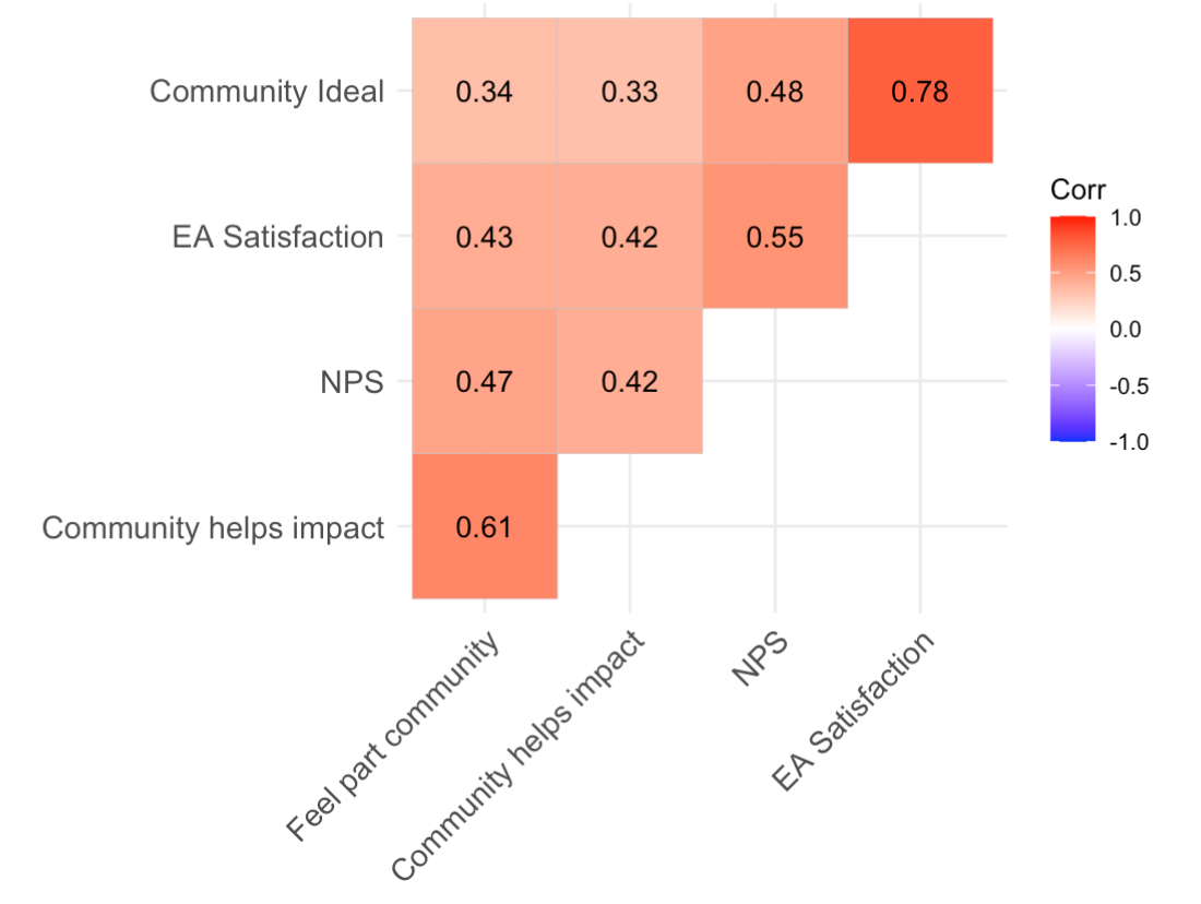 - Two ACSI questions about how well “the EA community compare[s] to your ideal?” and “your overall satisfaction with the EA community”