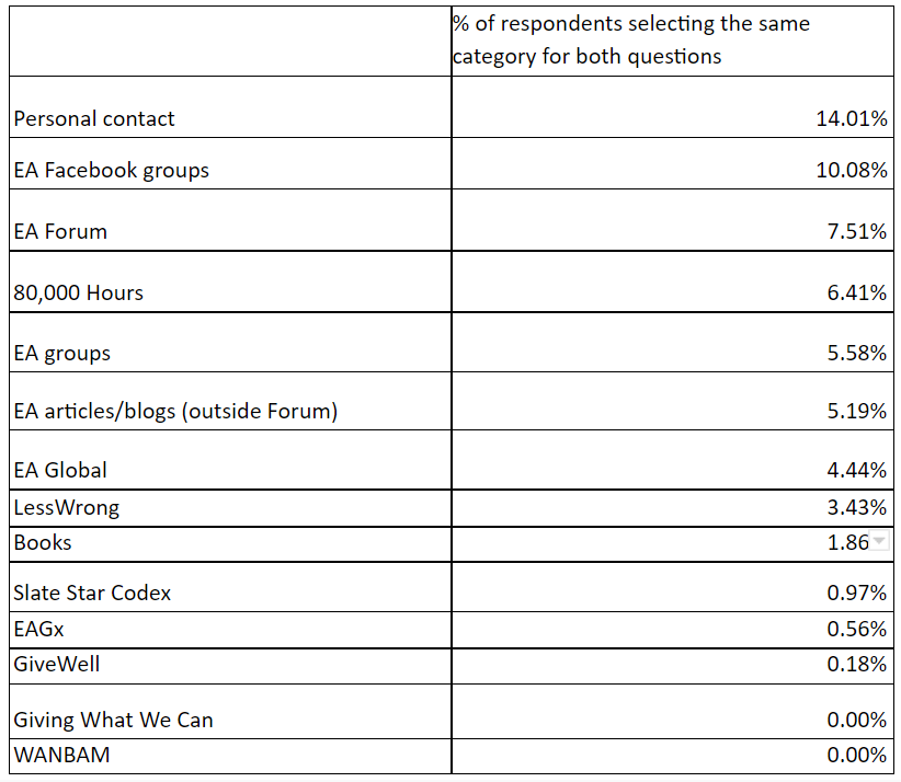 Personal contacts (38.7%), 80,000 Hours website (37.1%), GiveWell (32.1%), EA groups (25.6%), EA books (21.5%), 80,000 Hours podcast (20.6%) were cited by the largest percentages of respondents as having had the largest impact on their personal ability to have a positive impact