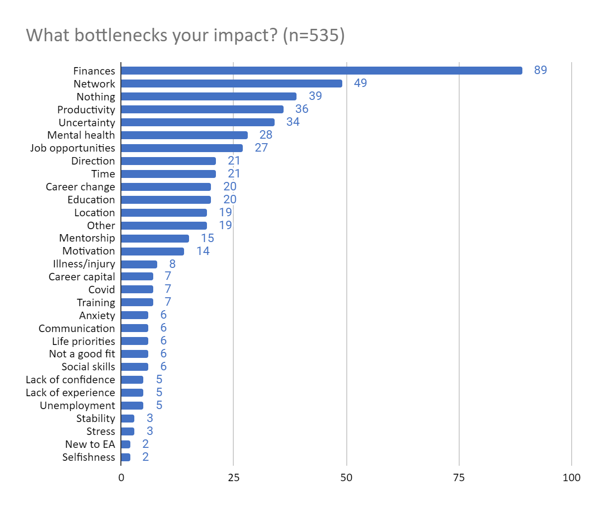The most commonly cited hindrances were related to personal/family finance, reduced/low income, or reduction in ability to donate. The second most mentioned bottleneck was lack of an EA/professional network. Inability to focus and be productive was also widely reported. 34 people felt uncertainty about which cause to pursue, where to donate, or what their next career step ought to be. Other bottlenecks reported include mental health, lack of job opportunities, lack of direction for how to apply their professional abilities, lack of time, inability to switch to a more effective career, lack of education, living location, need for a mentor, and lack of motivation.
