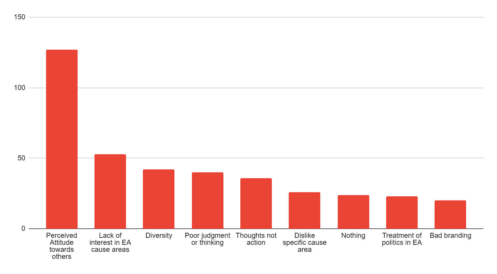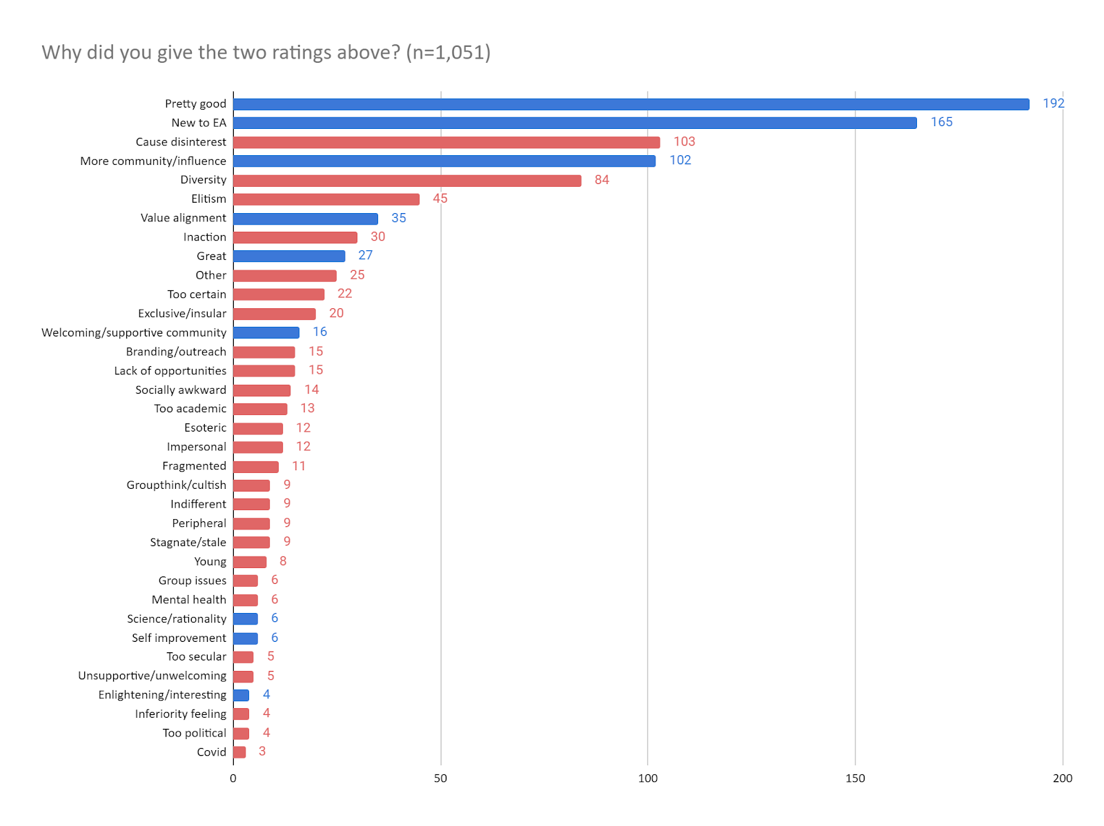 The two most commonly reported negative reasons for low ratings were a disinterest in EA causes or its current cause prioritization, and a lack of diversity in the EA community. The respondents included both a lack of diversity in gender, racial, and geographic representation, as well as a need for greater diversity of ideologies, practices, and perspectives.