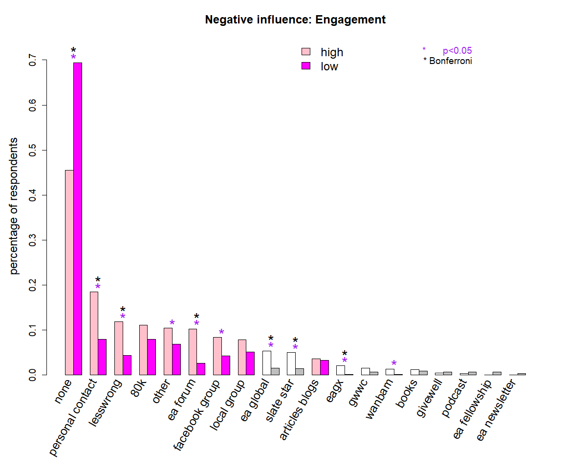 Personal contacts, EA groups, EA Global and the EA Forum, among others, were selected as a positive influence by a significantly higher percentage of more engaged respondents. However, personal contacts and the EA Forum were also significantly more likely to be selected as negative influences