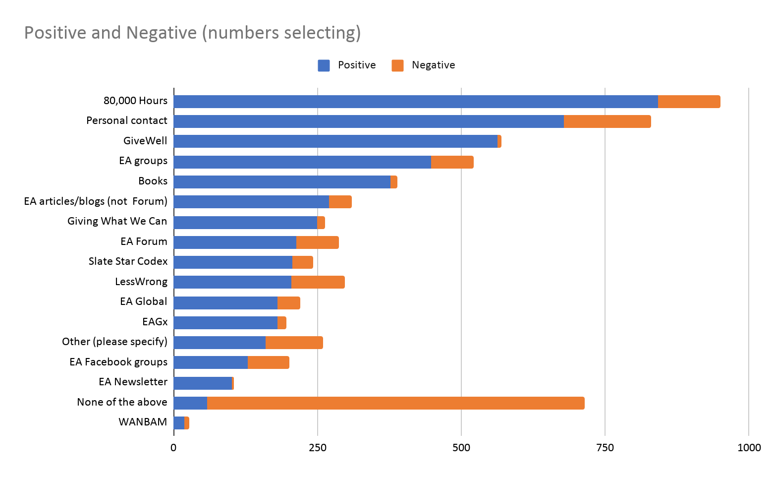 As we can see, 80,000 Hours and personal contact were commonly selected for both the positive question and the negative question (though considerably more commonly selected for the positive). In contrast GiveWell was very commonly selected for the positive question but very infrequently cited as a negative influence. EA groups were the fourth most commonly selected for the positive question, but also relatively frequently selected for the negative question.