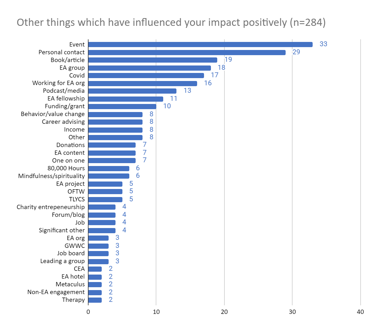 As was the case last year, a lot of the responses mentioned things that were already broader categories mentioned in the question. Personal contact with EAs, other professionals, or mentors was commonly mentioned as a positive influence. 19 people mentioned reading books or articles such as, The Precipice, Doing Good Better, and The Life You Can Save. Local, university, and virtual EA groups were reported as positive influences by 18 people. The pandemic was also mentioned as a positive influence by some, citing more free time, increased motivation to donate, and being able to interact with EAs globally. Other commonly reported influences were working for an EA org, some podcast or other media, EA fellowships, and funding/grants.