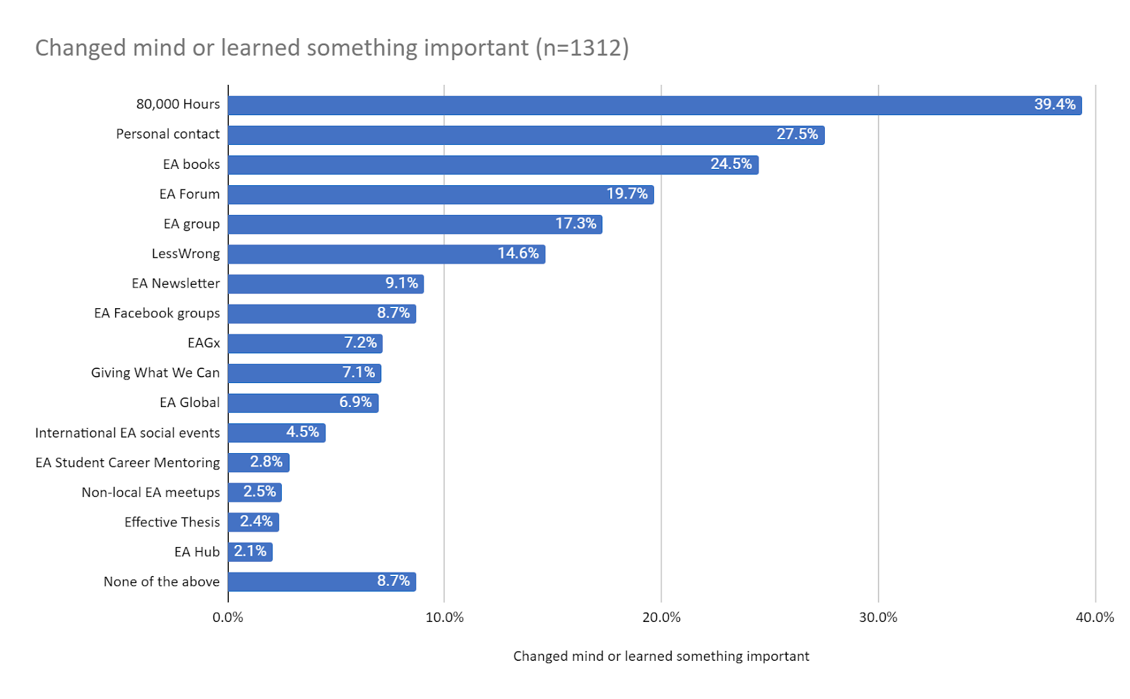 80,000 Hours was the factor most commonly selected as important for helping respondents change their mind or learn something important by a very large margin. This was followed by personal contacts and EA books, with the EA Forum following somewhat further behind.