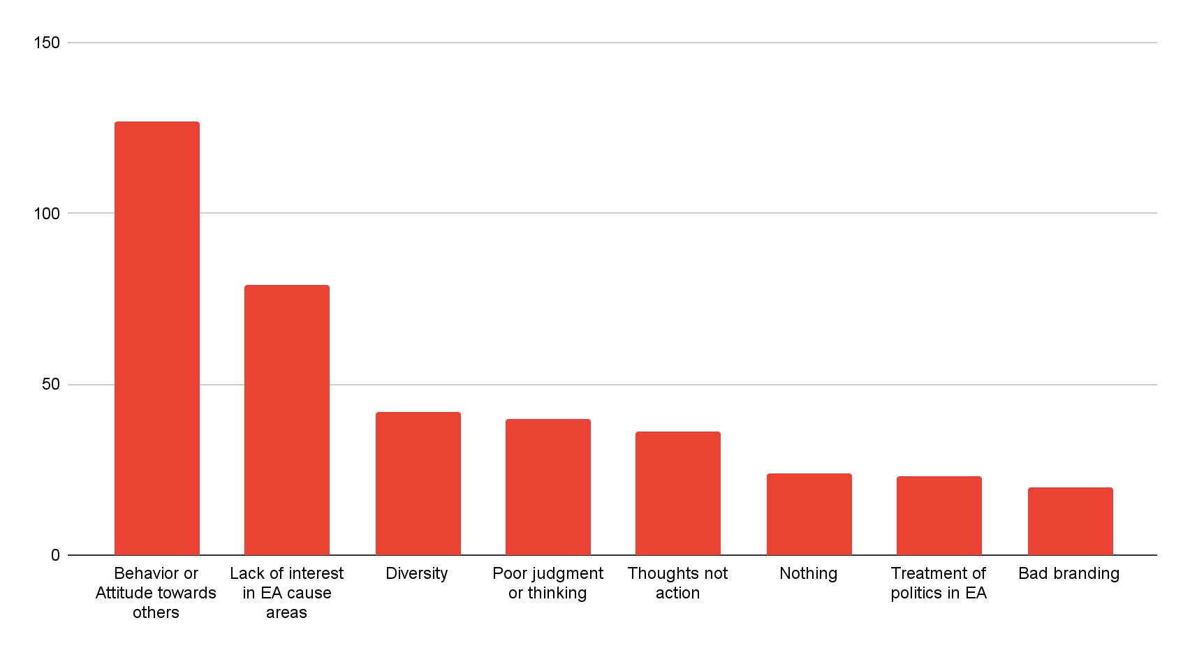 “Politics” included responses saying that EA was too woke/left and too capitalist (roughly twice as many in the former camp as the latter, but these are very small numbers so that ratio is inexact), and a very small number of mentions of too much politics, too little politics.