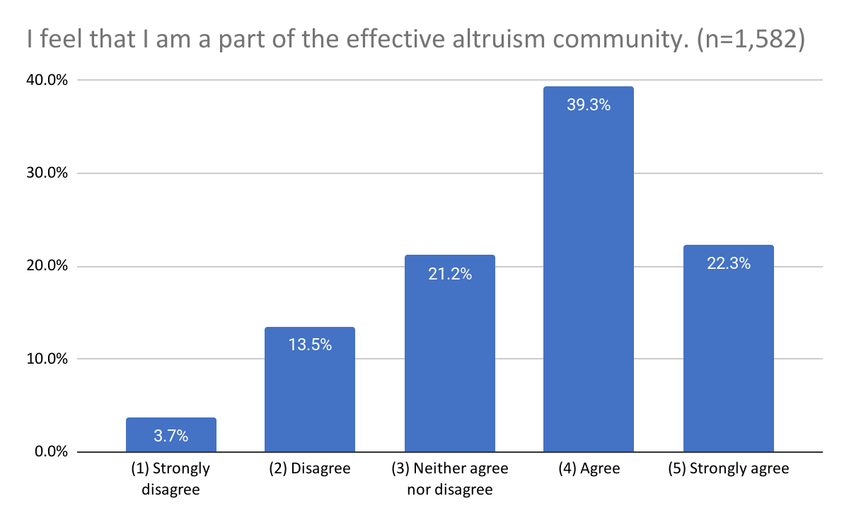 Likewise, a majority (61.6%) reported agreement that they “feel [they are] a part of the effective altruism community.” It’s not entirely clear how this should be interpreted, since it’s not entirely clear what being part of the effective altruism community means, and we suspect respondents may have interpreted this in a wide variety of different ways.