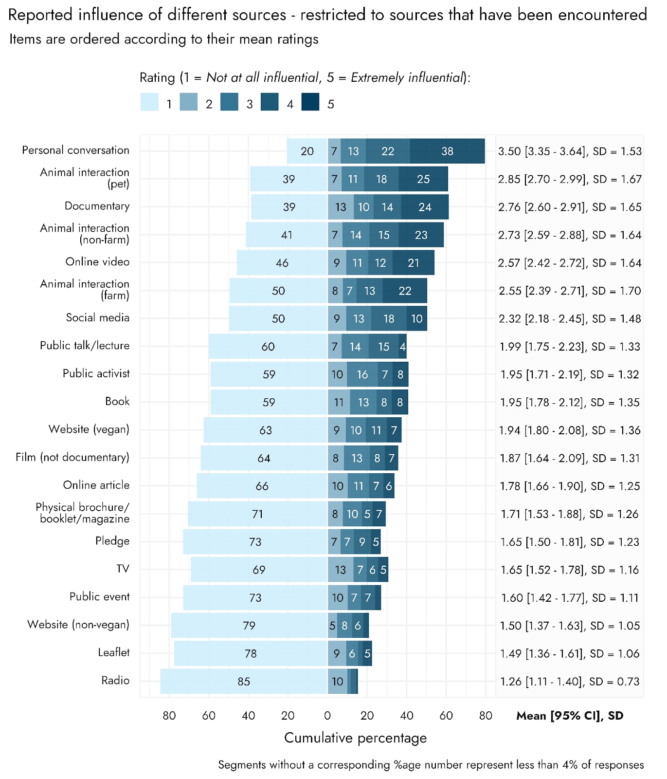 We also found that documentaries were reported to be among the most common factors that first influenced people to adopt a vegetarian or vegan diet, and as being generally reported as highly influential on respondents’ decisions.