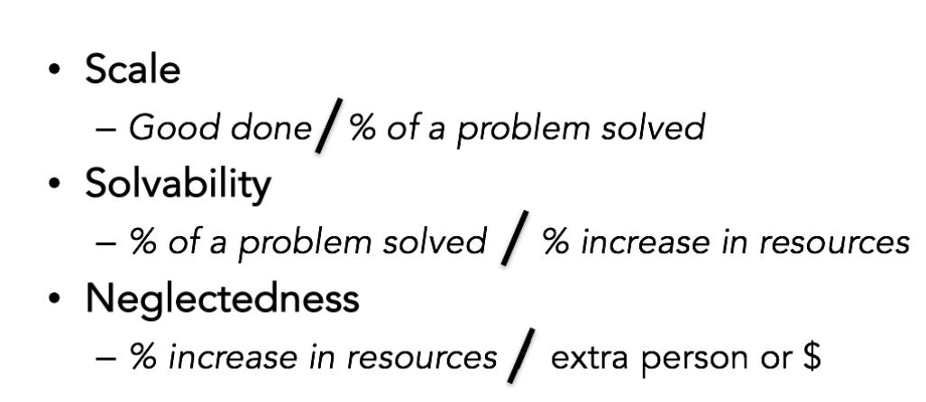 Although it might look like a list of criteria, the ITN framework is in fact an equation. Here’s 80,000 Hours: