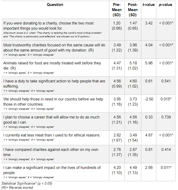We found significant, if small, improvements (by our standards) in knowledge, attitudes and values for the majority of our questions. We found null results for 3 items (“I have a duty to take significant action to help people that are suffering.” “I plan to choose a career that will allow me to do as much good as I can” “I have compared charities against each other on my own time.”) The first two of these may be partly explained by the high mean responses in the pre-workshop survey. The null result for students comparing charities “on their own time” is unsurprising as the post-workshop survey was administered immediately after the workshop, before most students would have had time to independently compare charities.