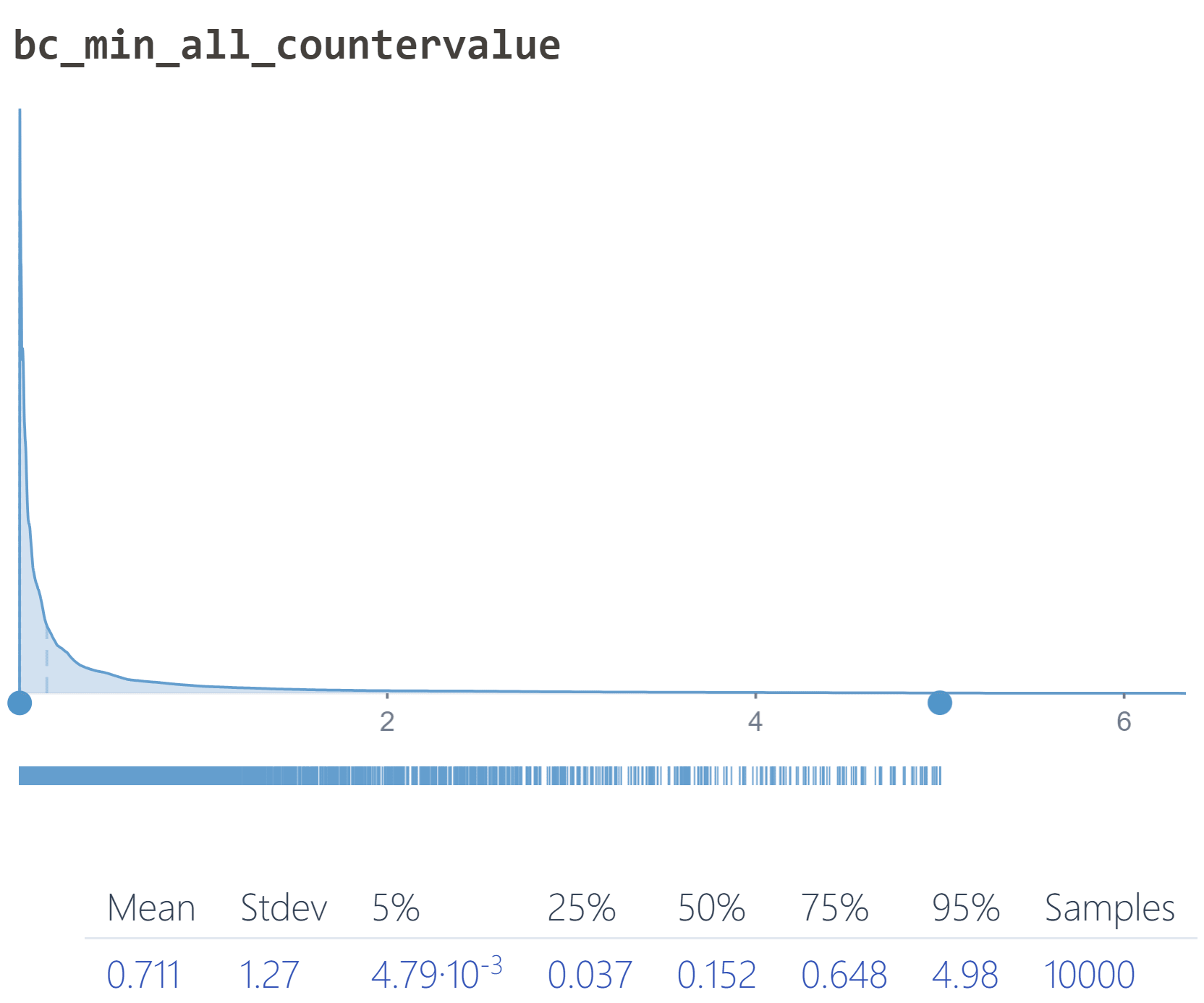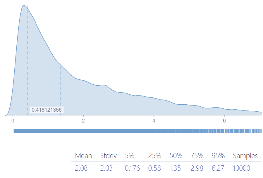 By now I have a detonation-soot ratio and a model for the number of detonations. Combining these, I get a distribution of the amount of stratospheric soot expected in a large-scale nuclear war.