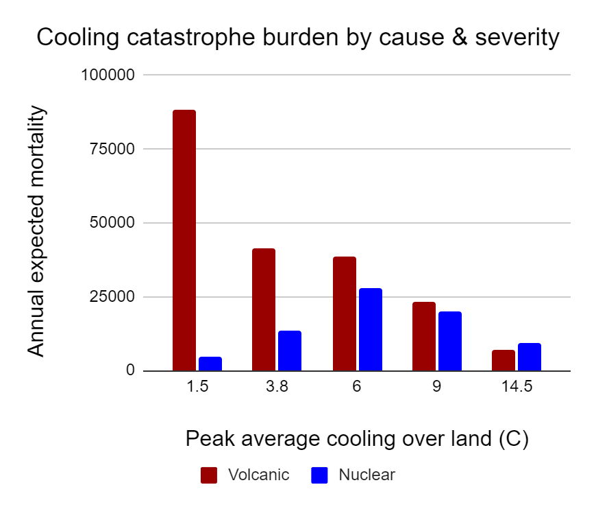 Contrast this with what proponents of nuclear winter might suggest: a 1% annual risk of a nuclear winter killing billions would have an annualized burden in the tens of millions.