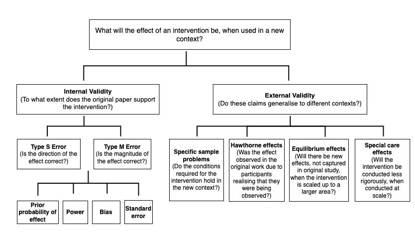 For external validity (how that result generalises to a different context, e.g. when using an RCT effect size to estimate how well an intervention will work in a different area), we should expect that the absolute median effect size will vary between different contexts by around 99% (so a 1X effect size could be as little as ~0X or ~2X in a different context; see Vivalt 2020). Note that the effect in the new context could be larger than our estimate of the true effect, but I expect that in most cases it will be smaller. Following Duflo & Banerjee (2017), we should attend to;