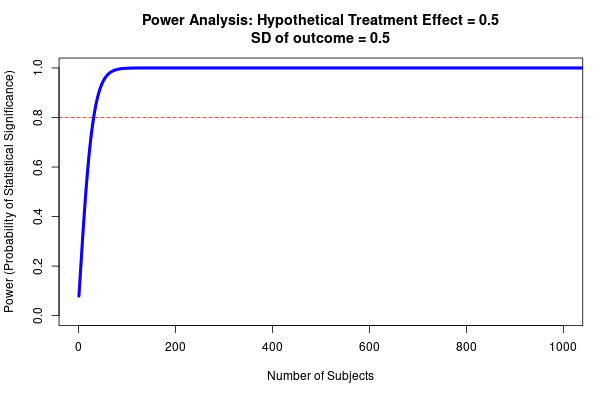 Fig 4; top row shows how sample size predicts power at different sized treatment effect, bottom row shows how sample size predicts power at different sized standard deviation. Note that this is for a simple research design (t-test with two groups, continuous outcome measure). Taken from https://egap.shinyapps.io/power-app/