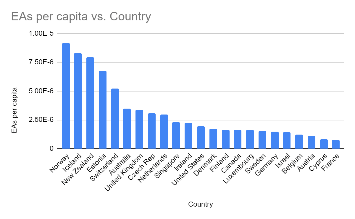 We’ll discuss the details more in the post we are putting together on this (hoping to release this month), but there is indeed quite a lot of noise when you look at EAs per capita, and in particular the highest EAs per capita countries, due to small populations and small numbers of respondents, often close to zero (e.g. small countries can jump in and out of the top rankings based on having 5 or 0 respondents in a year). In the full post we’ll additionally examine results for composites of years (e.g. 2020-2022), and which countries outperform what a model would predict (though that will be heavily caveated).