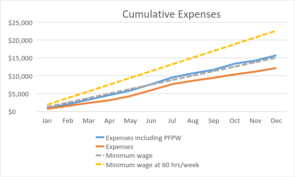 This seems like a big one. Your biggest expenditures are necessities: food and housing. You might be ok with cheaper housing and food, but certainly bringing your expenses to $0 in these categories would be extremely PWPF. On the other hand, people’s normal understanding of “living on minimum wage” includes things like “paying for housing and food”. So deducting the cost of minimally acceptable housing and food as PFPW wouldn’t make much sense.