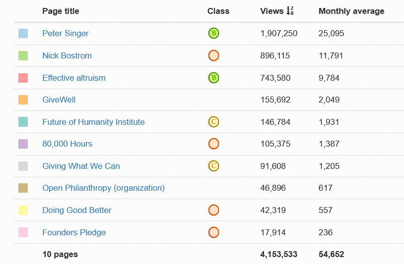 A great tool to get an overview of how many people read Wikipedia articles is the Wikipedia pageviews tool. What follows are a few screenshots displaying the pageviews for a selection of articles relevant to EA. The tool clearly shows that (i) some of these articles get a very large number of pageviews, and (ii) some pages get orders of magnitude more traffic than others.