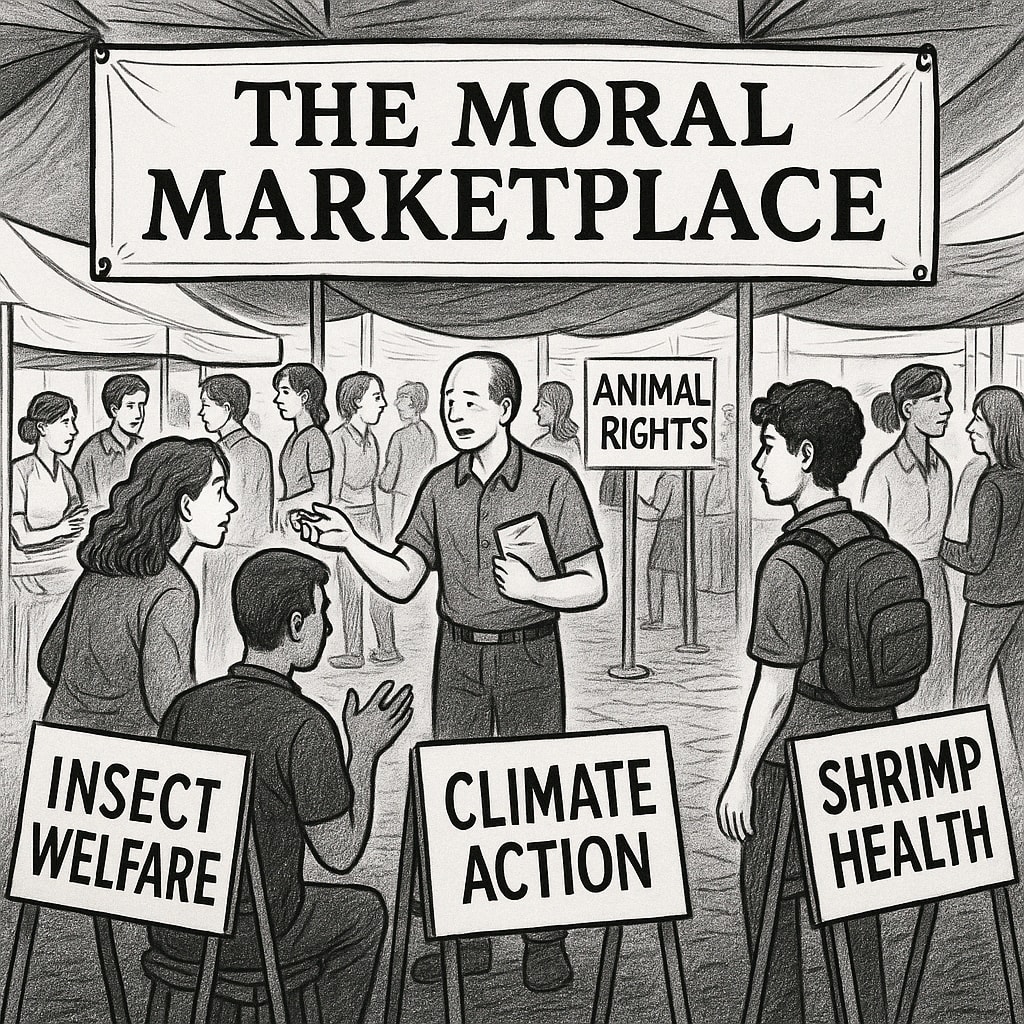 This creates a scenario where people working under the same banner are not working together at all, but merely coexisting as investors in a fragmented moral economy. Sub-movements become commodified (campaigns to either fund or ignore) while internal participants are subtly lobbied to align their resources according to the interpretive faction they belong to regarding their definitions of “good” and “effectiveness”. In this way, competing value systems are monetised, and Effective Altruism begins to resemble a bidding ground for causes, a kind of moral stock exchange.