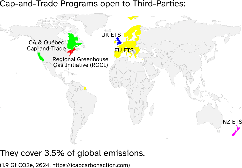 Epistemic status: confident that retiring an allowance in well-designed cap-and-trade programs prevents one ton of regulated CO2 emissions at a cost equal to the market price of that allowance. Such “well-designed” programs meet the four conditions outlined in the additionality section. Less confident about the effect of retiring allowances on global fuel markets and about political risk. Numbers are for mid-2025 unless noted.