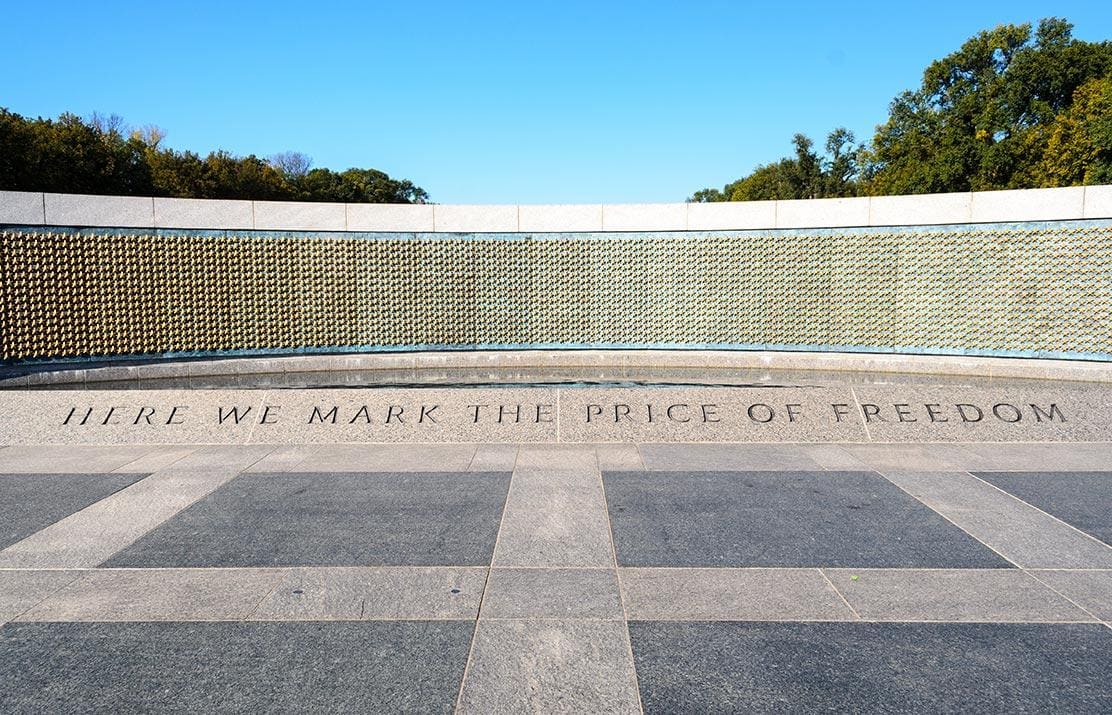 And I had another, related moment visiting Washington D.C., at the World War II memorial. There’s a wall fixed with four thousand golden stars, each representing a hundred American soldiers who died in the war. The inscription reads: “Here we mark the price of freedom.”