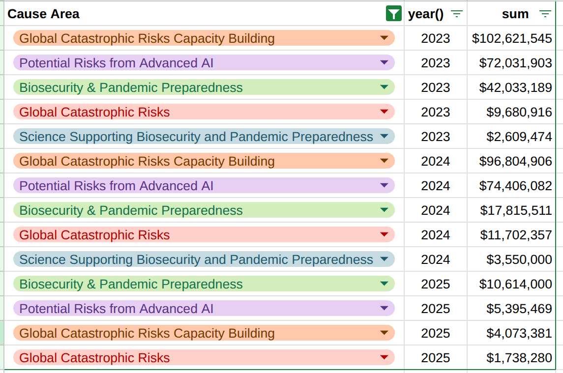 This is smaller than GiveWell (for now at least) but more than what OpenPhil donates to biosecurity (~$35M/year). For context here are some numbers from OpenPhil’s grants database (sheet)