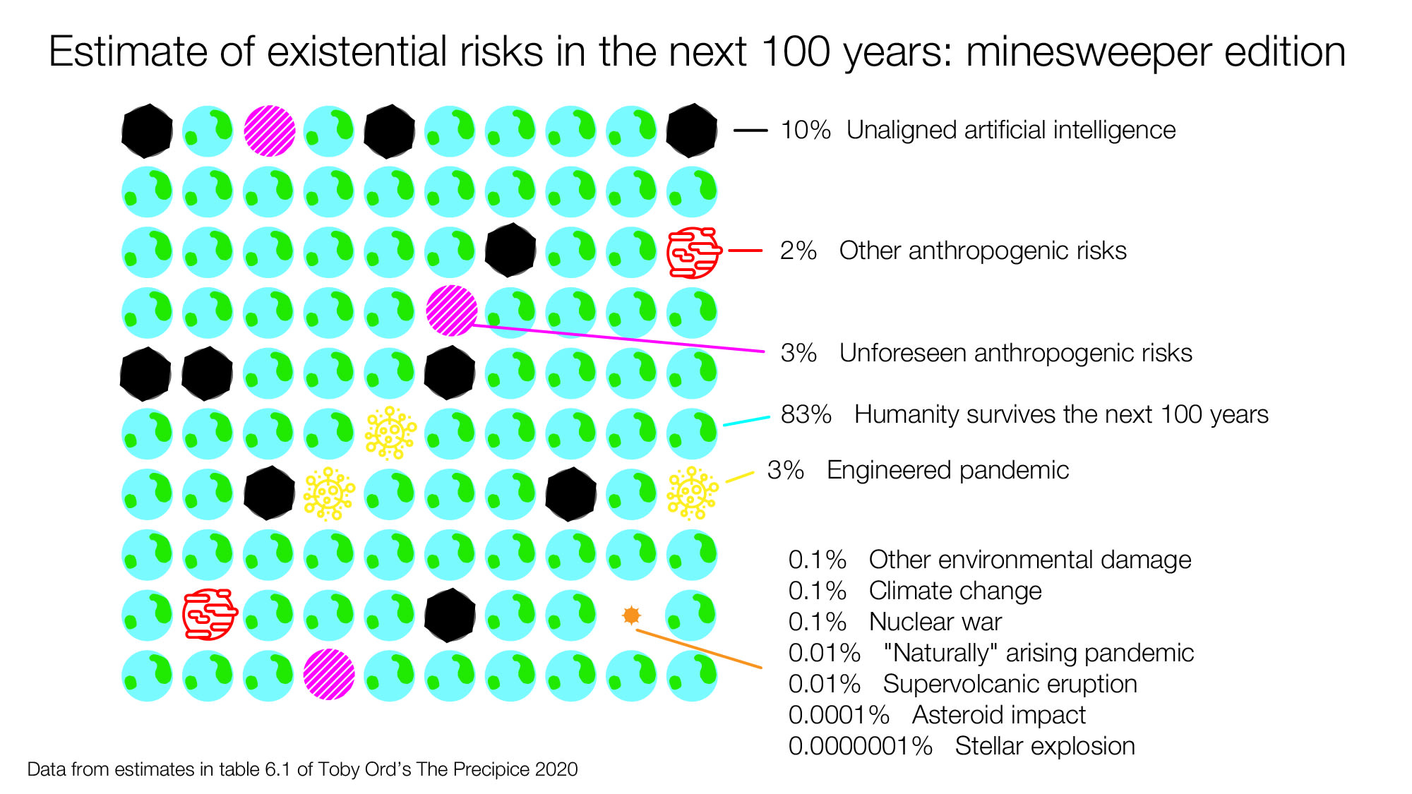 I’ve been reading Toby Ord’s thoughtful book, The Precipice. In it, he estimates there’s a 1 in 6 chance of humanity not surviving the next century. He has a table that summarizes the main sources of risk as he sees them that I thought could be more sharable and comparable if it were put into a diagram. So I made the following diagram in Illustrator (here’s the file if you want to play with it). If this seems like a useful thing to do, I’d love to get feedback on how it can be improved: