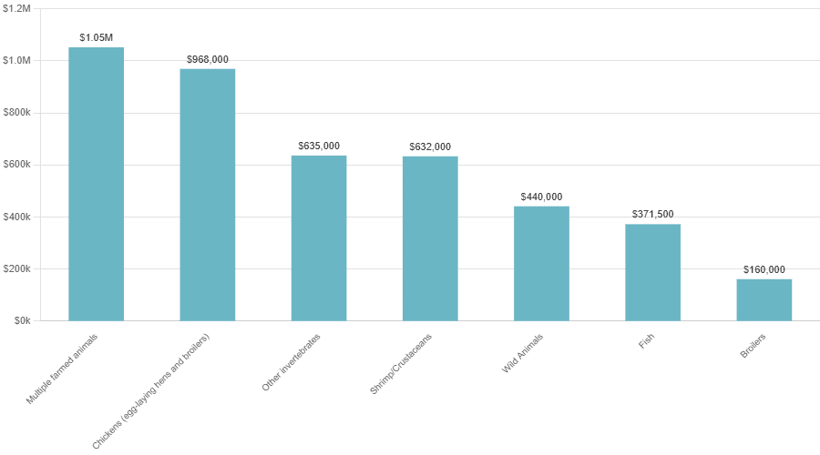 Note on categorization: “Welfare Campaigns” include all activities aimed at reducing farm animal suffering or increasing welfare, such as corporate outreach, producer outreach, accountability work on prior commitments, work with certifiers, etc. ”Policy Advocacy” is a broad term that includes policy work, legislative advocacy, and litigation. The category “Welfare Campaigns and Policy Advocacy” contains grants where organizations engage in significant portions of both activities. “Meta and Capacity Building” focuses on improving the effectiveness and resourcing of the animal advocacy movement, including evaluations of interventions, fundraising for effective organizations, strategic convenings, and implementation support. “Movement Building” focuses on strengthening the advocacy community through activities like training programs and conferences for advocates in a specific region. ”Other” includes activities not well-suited to the other categories, such as general support for organizations that engage in many activities, investor engagement to decrease funding for animal farming industries, content creation, etc.
