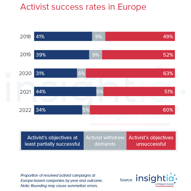 Insignia, an organisation that provides information on shareholder activism produces an annual report that includes statistics on success rates of shareholder activism. Figure 1 below in their 2023 report also shows success rates of shareholder activism over the last five years.